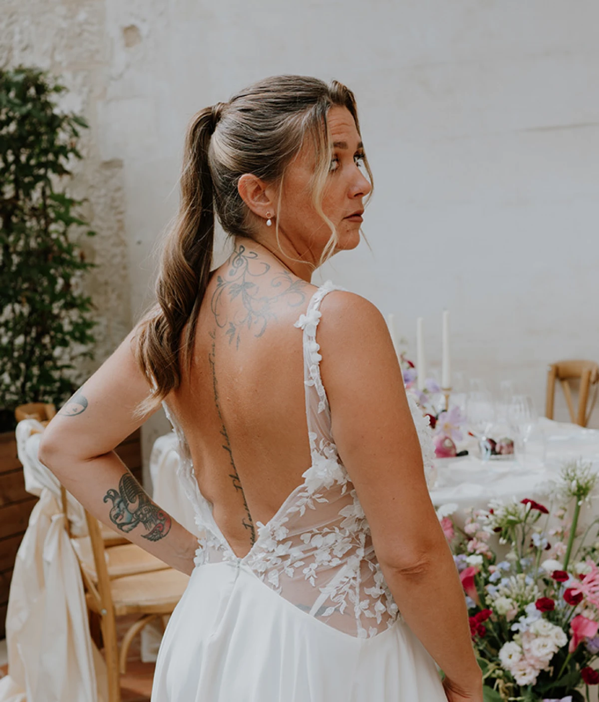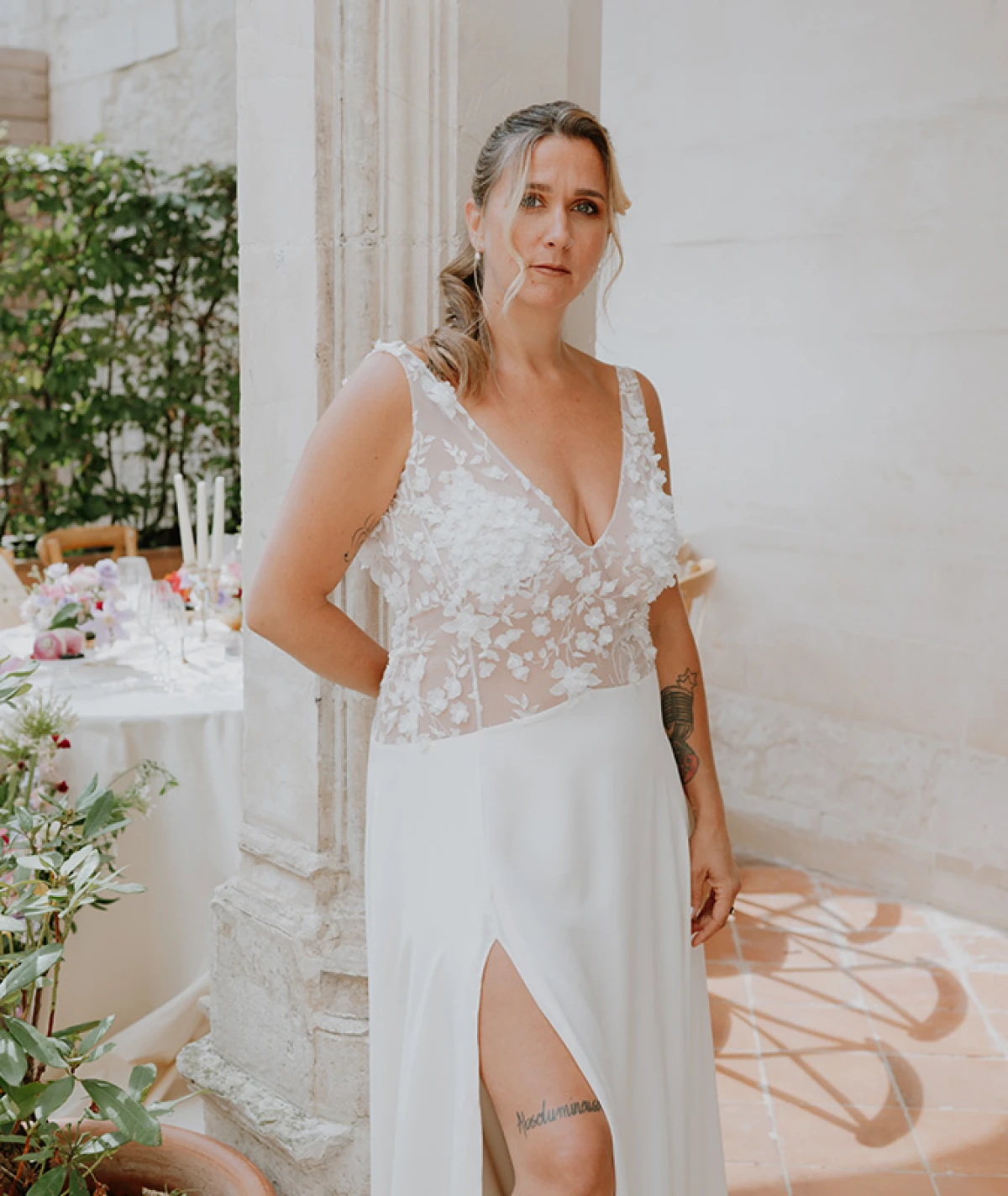 Des robes de mariée à Paris, à Troyes, à Narbonne et à Aix-en-Provence, aux styles moderne et épuré vous sont destinées et proposées par Élodie Groux. Au cœur du bouchon de Champagne, près de la Cathédrale de Troyes, ouvrez la porte de LA boutique de robes & tenues de mariée artistiques et uniques. LA Robe de mariée commence par vous et se trouve avec vous. Découvrez quelle mariée vous voulez être : atypique, audacieuse, douce, rêveuse, romantique, affirmée, simple et naturelle, féminine et élégante. Prête à vous révéler et à éclore, partez à la découverte de vos trésors intérieurs avec Élodie Groux pour faire naître ensemble la robe qui deviendra la vôtre ? Que vous fassiez une taille 38, 42 ou une taille 52, votre morphologie est placée au cœur des modèles de robes et en est l’inspiration. Ainsi, vous découvrez des robes de mariée qui vous correspondent autant dans le style que dans les coupes. Élodie vous fait essayer des coupes pensées et élaborées pour vous qui embelliront votre morphologie et révéleront votre personnalité. Elle prend le temps de vous écouter, d’apprendre à vous connaître et de regarder votre morphologie pour savoir exactement ce qui est fait pour vous. Vous découvrez des robes aux coupes voluptueuses, fluides, évasées, droites et ajustées sublimant votre silhouette et respectant votre morphologie. Un moment de douceur vous est consacré pour découvrir ce qui vous correspond et vous révèle. Imaginez-vous dans un cocon de douceur où la robe naît sous vos yeux, où étoffes et dentelles se posent sur votre peau. Pantalons, jupes et caraco en dentelles révèle à vous, pour y apporter votre touche personnelle. Au gré de vos envies et de vos idées, vous façonnez la robe qui deviendra la vôtre en la personnalisant. La robe de mariée vous révèle, vous honore et vous donne l’opportunité de créer votre robe de mariée idéale. Votre robe de mariée ou tenue civile reflète votre personnalité et raconte l’histoire d’amour qui vous unit. La liberté de choisir ce qui vous fait vibrer pour trouver votre robe de mariée est la démarche qu’Élodie Groux a construit pour vous, les femmes. Bénéficiez de l’accompagnement sur-mesure de la boutique avec la personnalisation incluse à des budgets accessibles. En accord avec votre morphologie, chaque coupe de robe de mariée est déclinée de la taille 34 à la taille 52. Sous une démarche inclusive et éco-responsable, les modèles des collections vous sont adressés et ont été élaborés pour vous, les femmes. Que vous soyez enceinte, complexée, petite, ronde, large d’épaules ou grande, vos idées et vos envies sont écoutées et considérées pour donner vie à votre robe de mariée idéale. Tous les modèles proposés correspondent à des morphologies différentes, A, B, H, S, X, et vous permettent d’essayer plusieurs coupes pour vous projeter. Les coupes se déclinent autant par le maintien de votre corps et la fluidité de la robe que par l’ajustement de la robe sur votre silhouette. La démarche de l’Inclusif a pour engagement de sublimer votre morphologie et de mettre en valeur votre silhouette. Essayez des modèles de robes, de jupes et pantalons de mariée pour vous projeter et définir avec Élodie Groux ce qui vous correspond, vous révèle. Les robes de mariée personnalisables et éco-responsable par Élodie Groux vous permettent de changer une dentelle, un décolleté, un tissu, une coupe pour que la robe devienne la vôtre. Un large choix de dentelles et de matières éco-responsables fabriquées en France s’offrent à vous. Chaque dentelle peut évoquer un trait de votre personnalité, votre côté romantique se traduit dans le dessin floral de la dentelle, votre côté atypique se dévoile dans la subtilité d’une dentelle originale. La dentelle s’imprègne de votre féminité. Les matières choisies s’inspirent de votre personnalité et reflètent votre tempérament. Les matières et dentelle, le style et la coupe ont pour volonté de vous mettre en valeur. Ainsi, au travers de ces éléments réunis, vous façonnez la robe qui devient la vôtre, celle qui vous représente. Votre robe raconte l’histoire d’amour qui vous unit et reflète votre personnalité.Les robes de mariée élaborées pour toutes les morphologies, sous un engagement éco-responsable par Élodie Groux