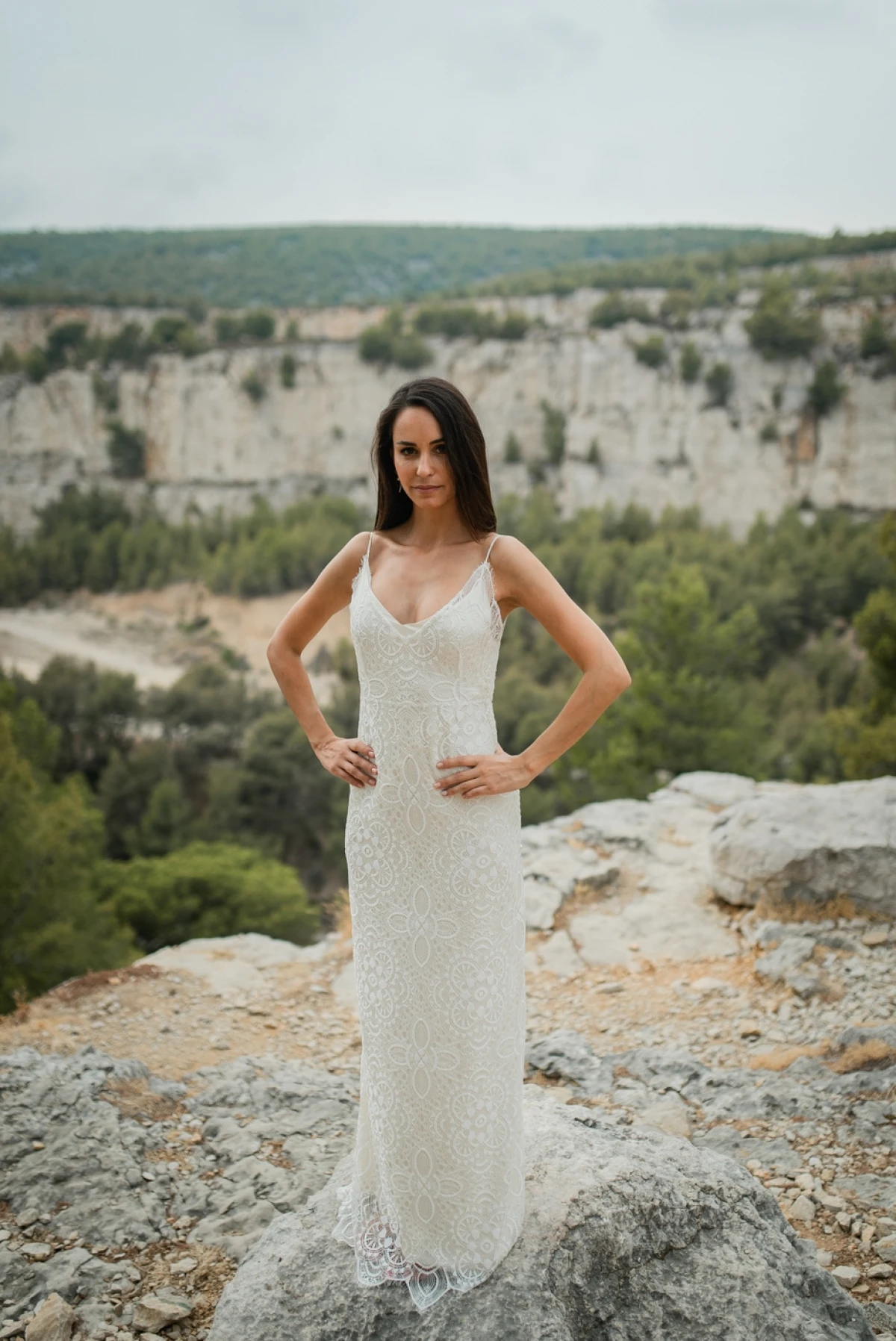 Pendant que l’on vous maquille, coiffe et durant un moment de la soirée mariage, rendez-vous toute votre splendeur en vous honorant à porter la seconde robe, la robe en dentelle. Votre corps est sublimé par les dessins de la dentelle, contournant et soulignant chaque courbe de votre silhouette. Cette robe en dentelle est réalisée sur-mesure à votre morphologie par une coupe qui la respectera.